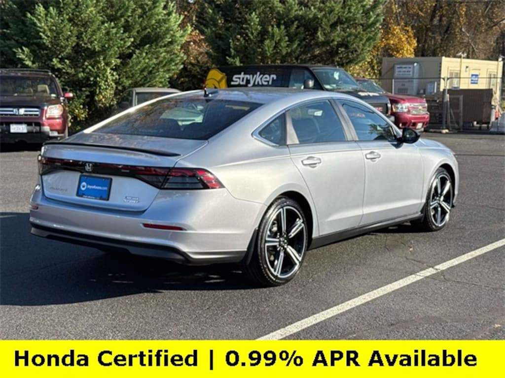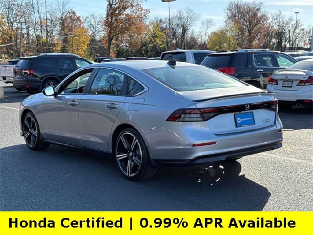 CARFAX One-Owner. Clean CARFAX. Certified. Solar Silver Metallic 2025 Honda Accord Hybrid Sport ***ONE OWNER***, ***LOW MILES***, ***DEALER MAINTAINED***, ***EXCELLENT CONDITION***, ***HONDA CERTIFIED***, ***ADAPTIVE CRUISE CONTROL***, ***ALLOY WHEELS***, ***BACK UP CAMERA***, ***BLIND SIDE MONITORING***, ***FORWARD COLLISION ALERT***, ***LANE DEPARTURE WARNING***, ***POWER MOONROOF***, ***POWER SEAT***, ***REMOTE START***, HondaTrue Certified Certified, 2.0L I4 DOHC 16V, 4-Wheel Disc Brakes, 8 Speakers, ABS brakes, Adaptive Cruise Control: Adaptive Cruise Control (ACC) with Low-Speed Follow, Air Conditioning, Alloy wheels, AM/FM radio, Apple CarPlay/Android Auto, Auto High-beam Headlights, Automatic temperature control, Blind Spot Information (BSI) System warning, Brake assist, Bumpers: body-color, Compass, Delay-off headlights, Driver door bin, Driver vanity mirror, Dual front impact airbags, Dual front side impact airbags, Electronic Stability Control, Emergency communication system: HondaLink, Exterior Parking Camera Rear, Fabric Seat Trim, Four wheel independent suspension, Front anti-roll bar, Front Bucket Seats, Front Center Armrest, Front dual zone A/C, Front reading lights, Fully automatic headlights, Heated Front Bucket Seats, Heated front seats, Illuminated entry, Knee airbag, Lane departure: Lane Keeping Assist System (LKAS) active, Leather Shift Knob, Leather steering wheel, Low tire pressure warning, Occupant sensing airbag, Outside temperature display, Overhead airbag, Overhead console, Panic alarm, Passenger door bin, Passenger vanity mirror, Power door mirrors, Power driver seat, Power moonroof, Power steering, Power windows, Radio data system, Radio: 180-Watt Audio System, Rear anti-roll bar, Rear reading lights, Rear seat center armrest, Rear side impact airbag, Rear window defroster, Remote keyless entry, Security system, Speed control, Speed-sensing steering, Speed-Sensitive Wipers, Split folding rear seat, Spoiler, Steering wheel mounted audio controls, Telescoping steering wheel, Tilt steering wheel, Traction control, Trip computer, Variably intermittent wipers, Wheels: 19" x 8.5J Berlina Black, 2.0L I4 DOHC 16V.