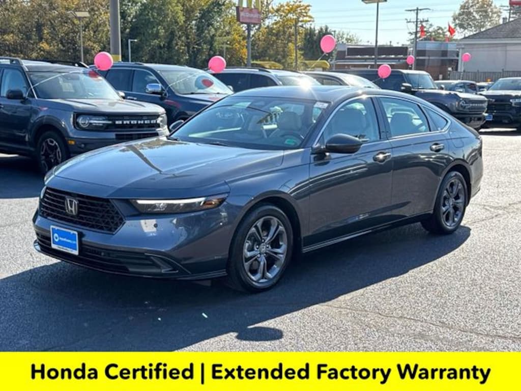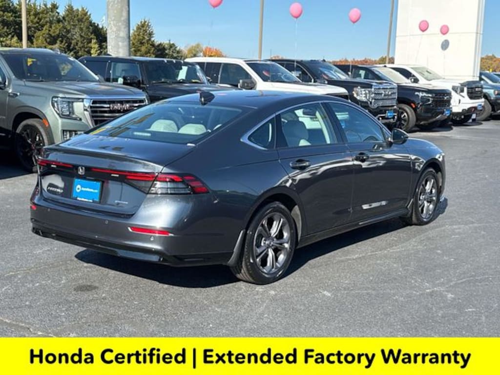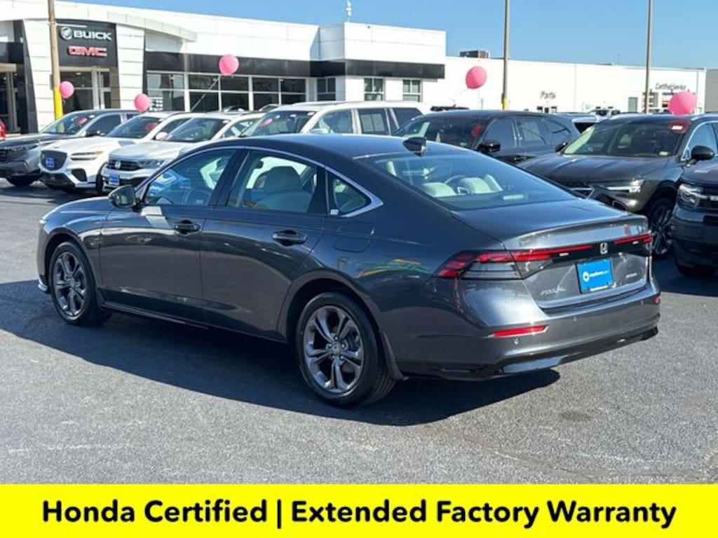 CARFAX One-Owner. Clean CARFAX. Certified. Meteorite Gray Metallic 2025 Honda Accord Hybrid EX-L ***ONE OWNER***, ***LOW MILES***, ***DEALER MAINTAINED***, ***EXCELLENT CONDITION***, ***HONDA CERTIFIED***, ***ADAPTIVE CRUISE CONTROL***, ***ALLOY WHEELS***, ***BACK UP CAMERA***, ***BLIND SIDE MONITORING***, ***FORWARD COLLISION ALERT***, ***LANE DEPARTURE WARNING***, ***HEATED SEATS***, ***LEATHER***, ***POWER MOONROOF***, ***POWER SEATS***, ***REMOTE START***, HondaTrue Certified Certified, 2.0L I4 DOHC 16V, 4-Wheel Disc Brakes, 8 Speakers, ABS brakes, Adaptive Cruise Control: Adaptive Cruise Control (ACC) with Low-Speed Follow, Air Conditioning, Alloy wheels, AM/FM radio, Apple CarPlay/Android Auto, Auto High-beam Headlights, Auto-dimming Rear-View mirror, Automatic temperature control, Blind Spot Information (BSI) System warning, Brake assist, Bumpers: body-color, Compass, Delay-off headlights, Driver door bin, Driver vanity mirror, Dual front impact airbags, Dual front side impact airbags, Electronic Stability Control, Emergency communication system: HondaLink, Exterior Parking Camera Rear, Four wheel independent suspension, Front anti-roll bar, Front Bucket Seats, Front Center Armrest, Front dual zone A/C, Front reading lights, Fully automatic headlights, Heated door mirrors, Heated Front Bucket Seats, Heated front seats, Illuminated entry, Knee airbag, Lane departure: Lane Keeping Assist System (LKAS) active, Leather Shift Knob, Leather steering wheel, Leather-Trimmed Seat Trim, Low tire pressure warning, Memory seat, Occupant sensing airbag, Outside temperature display, Overhead airbag, Overhead console, Panic alarm, Passenger door bin, Passenger vanity mirror, Power door mirrors, Power driver seat, Power moonroof, Power passenger seat, Power steering, Power windows, Radio data system, Radio: 180-Watt Audio System, Rear anti-roll bar, Rear reading lights, Rear seat center armrest, Rear side impact airbag, Rear window defroster, Remote keyless entry, Security system, Speed control, Speed-sensing steering, Speed-Sensitive Wipers, Split folding rear seat, Steering wheel mounted audio controls, Telescoping steering wheel, Tilt steering wheel, Traction control, Trip computer, Turn signal indicator mirrors, Variably intermittent wipers, Wheels: 17" x 7.5J Pewter Gray, 2.0L I4 DOHC 16V.
