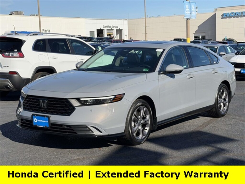 CARFAX One-Owner. Clean CARFAX. Certified. Meteorite Gray Metallic 2025 Honda Accord Hybrid EX-L ***ONE OWNER***, ***LOW MILES***, ***DEALER MAINTAINED***, ***EXCELLENT CONDITION***, ***HONDA CERTIFIED***, ***ADAPTIVE CRUISE CONTROL***, ***ALLOY WHEELS***, ***BACK UP CAMERA***, ***BLIND SIDE MONITORING***, ***FORWARD COLLISION ALERT***, ***LANE DEPARTURE WARNING***, ***HEATED SEATS***, ***LEATHER***, ***POWER MOONROOF***, ***POWER SEATS***, ***REMOTE START***, HondaTrue Certified Certified, 2.0L I4 DOHC 16V, 4-Wheel Disc Brakes, 8 Speakers, ABS brakes, Adaptive Cruise Control: Adaptive Cruise Control (ACC) with Low-Speed Follow, Air Conditioning, Alloy wheels, AM/FM radio, Apple CarPlay/Android Auto, Auto High-beam Headlights, Auto-dimming Rear-View mirror, Automatic temperature control, Blind Spot Information (BSI) System warning, Brake assist, Bumpers: body-color, Compass, Delay-off headlights, Driver door bin, Driver vanity mirror, Dual front impact airbags, Dual front side impact airbags, Electronic Stability Control, Emergency communication system: HondaLink, Exterior Parking Camera Rear, Four wheel independent suspension, Front anti-roll bar, Front Bucket Seats, Front Center Armrest, Front dual zone A/C, Front reading lights, Fully automatic headlights, Heated door mirrors, Heated Front Bucket Seats, Heated front seats, Illuminated entry, Knee airbag, Lane departure: Lane Keeping Assist System (LKAS) active, Leather Shift Knob, Leather steering wheel, Leather-Trimmed Seat Trim, Low tire pressure warning, Memory seat, Occupant sensing airbag, Outside temperature display, Overhead airbag, Overhead console, Panic alarm, Passenger door bin, Passenger vanity mirror, Power door mirrors, Power driver seat, Power moonroof, Power passenger seat, Power steering, Power windows, Radio data system, Radio: 180-Watt Audio System, Rear anti-roll bar, Rear reading lights, Rear seat center armrest, Rear side impact airbag, Rear window defroster, Remote keyless entry, Security system, Speed control, Speed-sensing steering, Speed-Sensitive Wipers, Split folding rear seat, Steering wheel mounted audio controls, Telescoping steering wheel, Tilt steering wheel, Traction control, Trip computer, Turn signal indicator mirrors, Variably intermittent wipers, Wheels: 17" x 7.5J Pewter Gray, 2.0L I4 DOHC 16V.