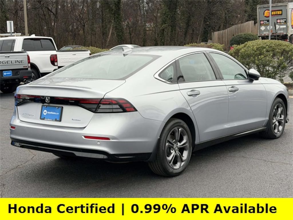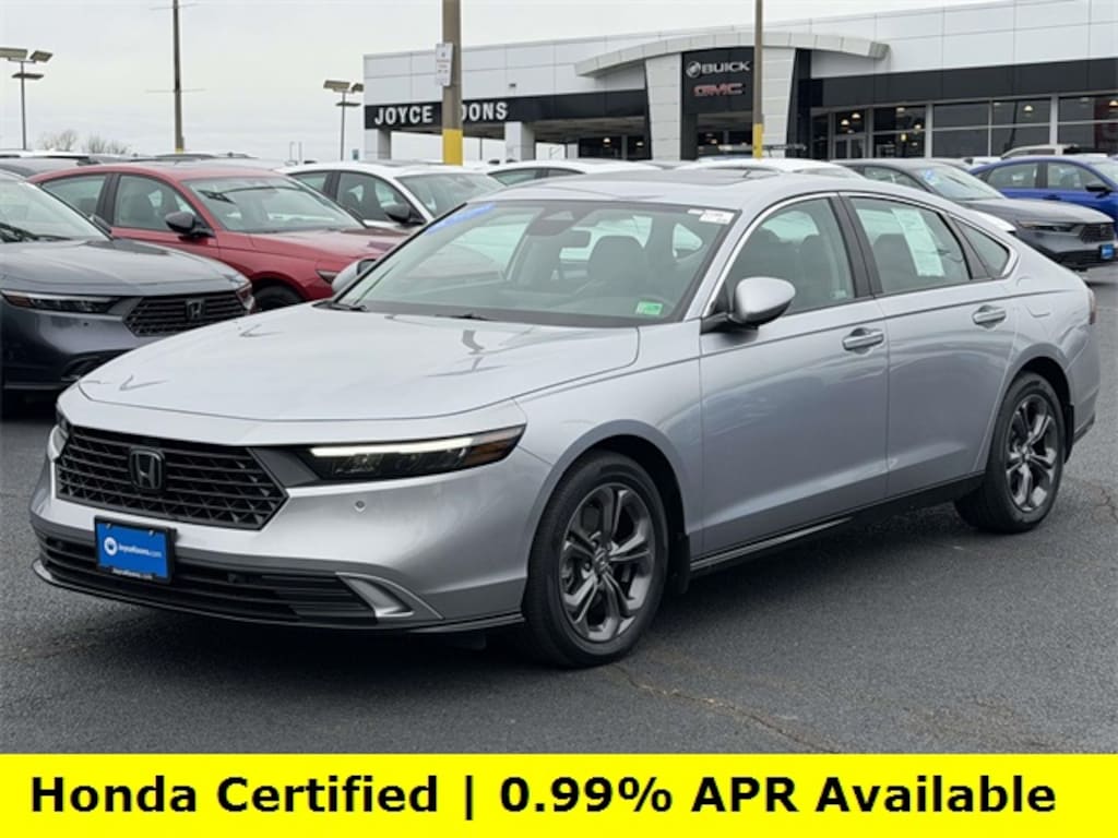 CARFAX One-Owner. Clean CARFAX. Certified. Solar Silver Metallic 2025 Honda Accord Hybrid EX-L ***ONE OWNER***, ***LOW MILES***, ***DEALER MAINTAINED***, ***EXCELLENT CONDITION***, ***HONDA CERTIFIED***, ***ADAPTIVE CRUISE CONTROL***, ***ALLOY WHEELS***, ***BACK UP CAMERA***, ***BLIND SIDE MONITORING***, ***FORWARD COLLISION ALERT***, ***LANE DEPARTURE WARNING***, ***HEATED SEATS***, ***LEATHER***, ***POWER MOONROOF***, ***POWER SEATS***, ***REMOTE START***, HondaTrue Certified Certified, 2.0L I4 DOHC 16V, 4-Wheel Disc Brakes, 8 Speakers, ABS brakes, Adaptive Cruise Control: Adaptive Cruise Control (ACC) with Low-Speed Follow, Air Conditioning, Alloy wheels, AM/FM radio, Apple CarPlay/Android Auto, Auto High-beam Headlights, Auto-dimming Rear-View mirror, Automatic temperature control, Blind Spot Information (BSI) System warning, Brake assist, Bumpers: body-color, Compass, Delay-off headlights, Driver door bin, Driver vanity mirror, Dual front impact airbags, Dual front side impact airbags, Electronic Stability Control, Emergency communication system: HondaLink, Exterior Parking Camera Rear, Four wheel independent suspension, Front anti-roll bar, Front Bucket Seats, Front Center Armrest, Front dual zone A/C, Front reading lights, Fully automatic headlights, Heated door mirrors, Heated Front Bucket Seats, Heated front seats, Illuminated entry, Knee airbag, Lane departure: Lane Keeping Assist System (LKAS) active, Leather Shift Knob, Leather steering wheel, Leather-Trimmed Seat Trim, Low tire pressure warning, Memory seat, Occupant sensing airbag, Outside temperature display, Overhead airbag, Overhead console, Panic alarm, Passenger door bin, Passenger vanity mirror, Power door mirrors, Power driver seat, Power moonroof, Power passenger seat, Power steering, Power windows, Radio data system, Radio: 180-Watt Audio System, Rear anti-roll bar, Rear reading lights, Rear seat center armrest, Rear side impact airbag, Rear window defroster, Remote keyless entry, Security system, Speed control, Speed-sensing steering, Speed-Sensitive Wipers, Split folding rear seat, Steering wheel mounted audio controls, Telescoping steering wheel, Tilt steering wheel, Traction control, Trip computer, Turn signal indicator mirrors, Variably intermittent wipers, Wheels: 17" x 7.5J Pewter Gray, 2.0L I4 DOHC 16V.