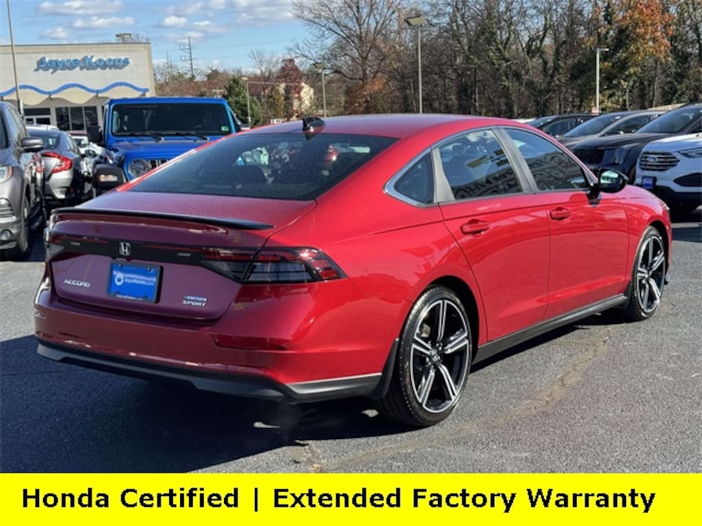 CARFAX One-Owner. Certified. Radiant Red Metallic 2025 Honda Accord Hybrid Sport ***ONE OWNER***, ***LOW MILES***, ***DEALER MAINTAINED***, ***EXCELLENT CONDITION***, ***HONDA CERTIFIED***, ***ADAPTIVE CRUISE CONTROL***, ***ALLOY WHEELS***, ***BACK UP CAMERA***, ***FORWARD COLLISION ALERT***, ***LANE DEPARTURE WARNING***, ***HARD TOP***, ***POWER MOONROOF***, ***POWER SEAT***, ***REMOTE START***, HondaTrue Certified Certified, 2.0L I4 DOHC 16V, 4-Wheel Disc Brakes, 8 Speakers, ABS brakes, Adaptive Cruise Control: Adaptive Cruise Control (ACC) with Low-Speed Follow, Air Conditioning, Alloy wheels, AM/FM radio, Apple CarPlay/Android Auto, Auto High-beam Headlights, Automatic temperature control, Blind Spot Information (BSI) System warning, Brake assist, Bumpers: body-color, Compass, Delay-off headlights, Driver door bin, Driver vanity mirror, Dual front impact airbags, Dual front side impact airbags, Electronic Stability Control, Emergency communication system: HondaLink, Exterior Parking Camera Rear, Fabric Seat Trim, Four wheel independent suspension, Front anti-roll bar, Front Bucket Seats, Front Center Armrest, Front dual zone A/C, Front reading lights, Fully automatic headlights, Heated Front Bucket Seats, Heated front seats, Illuminated entry, Knee airbag, Lane departure: Lane Keeping Assist System (LKAS) active, Leather Shift Knob, Leather steering wheel, Low tire pressure warning, Occupant sensing airbag, Outside temperature display, Overhead airbag, Overhead console, Panic alarm, Passenger door bin, Passenger vanity mirror, Power door mirrors, Power driver seat, Power moonroof, Power steering, Power windows, Radio data system, Radio: 180-Watt Audio System, Rear anti-roll bar, Rear reading lights, Rear seat center armrest, Rear side impact airbag, Rear window defroster, Remote keyless entry, Security system, Speed control, Speed-sensing steering, Speed-Sensitive Wipers, Split folding rear seat, Spoiler, Steering wheel mounted audio controls, Telescoping steering wheel, Tilt steering wheel, Traction control, Trip computer, Variably intermittent wipers, Wheels: 19" x 8.5J Berlina Black, 2.0L I4 DOHC 16V.