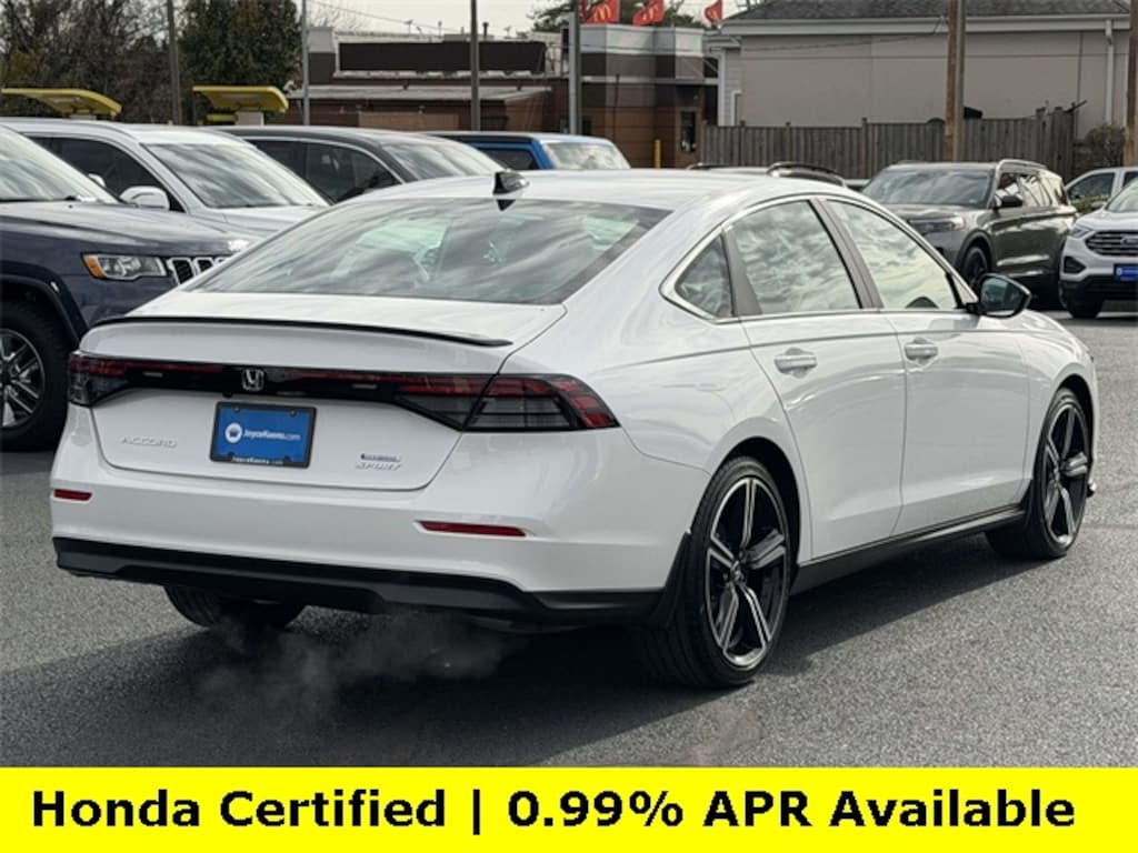 CARFAX One-Owner. Clean CARFAX. Certified. Platinum White Pearl 2025 Honda Accord Hybrid Sport ***ONE OWNER***, ***LOW MILES***, ***DEALER MAINTAINED***, ***EXCELLENT CONDITION***, ***HONDA CERTIFIED***, ***ADAPTIVE CRUISE CONTROL***, ***ALLOY WHEELS***, ***BACK UP CAMERA***, ***BLIND SIDE MONITORING***, ***FORWARD COLLISION ALERT***, ***LANE DEPARTURE WARNING***, ***POWER MOONROOF***, ***POWER SEAT***, ***REMOTE START***, HondaTrue Certified Certified, 2.0L I4 DOHC 16V, 4-Wheel Disc Brakes, 8 Speakers, ABS brakes, Adaptive Cruise Control: Adaptive Cruise Control (ACC) with Low-Speed Follow, Air Conditioning, Alloy wheels, AM/FM radio, Apple CarPlay/Android Auto, Auto High-beam Headlights, Automatic temperature control, Blind Spot Information (BSI) System warning, Brake assist, Bumpers: body-color, Compass, Delay-off headlights, Driver door bin, Driver vanity mirror, Dual front impact airbags, Dual front side impact airbags, Electronic Stability Control, Emergency communication system: HondaLink, Exterior Parking Camera Rear, Fabric Seat Trim, Four wheel independent suspension, Front anti-roll bar, Front Bucket Seats, Front Center Armrest, Front dual zone A/C, Front reading lights, Fully automatic headlights, Heated Front Bucket Seats, Heated front seats, Illuminated entry, Knee airbag, Lane departure: Lane Keeping Assist System (LKAS) active, Leather Shift Knob, Leather steering wheel, Low tire pressure warning, Occupant sensing airbag, Outside temperature display, Overhead airbag, Overhead console, Panic alarm, Passenger door bin, Passenger vanity mirror, Power door mirrors, Power driver seat, Power moonroof, Power steering, Power windows, Radio data system, Radio: 180-Watt Audio System, Rear anti-roll bar, Rear reading lights, Rear seat center armrest, Rear side impact airbag, Rear window defroster, Remote keyless entry, Security system, Speed control, Speed-sensing steering, Speed-Sensitive Wipers, Split folding rear seat, Spoiler, Steering wheel mounted audio controls, Telescoping steering wheel, Tilt steering wheel, Traction control, Trip computer, Variably intermittent wipers, Wheels: 19" x 8.5J Berlina Black, 2.0L I4 DOHC 16V.