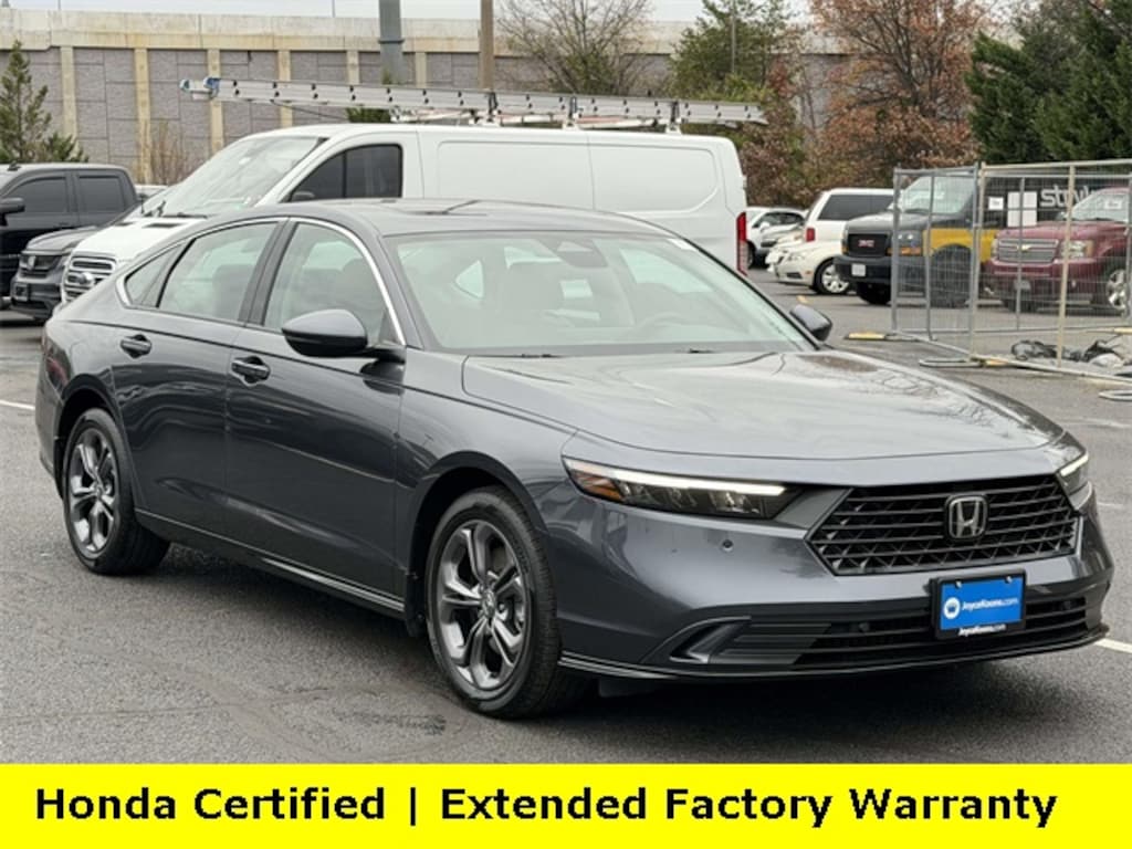 CARFAX One-Owner. Certified. Meteorite Gray Metallic 2025 Honda Accord Hybrid EX-L ***ONE OWNER***, ***LOW MILES***, ***DEALER MAINTAINED***, ***EXCELLENT CONDITION***, ***HONDA CERTIFIED***, ***ADAPTIVE CRUISE CONTROL***, ***ALLOY WHEELS***, ***BACK UP CAMERA***, ***BLIND SIDE MONITORING***, ***FORWARD COLLISION ALERT***, ***LANE DEPARTURE WARNING***, ***HEATED SEATS***, ***LEATHER***, ***POWER MOONROOF***, ***POWER SEATS***, ***REMOTE START***, HondaTrue Certified Certified, 2.0L I4 DOHC 16V, 4-Wheel Disc Brakes, 8 Speakers, ABS brakes, Adaptive Cruise Control: Adaptive Cruise Control (ACC) with Low-Speed Follow, Air Conditioning, Alloy wheels, AM/FM radio, Apple CarPlay/Android Auto, Auto High-beam Headlights, Auto-dimming Rear-View mirror, Automatic temperature control, Blind Spot Information (BSI) System warning, Brake assist, Bumpers: body-color, Compass, Delay-off headlights, Driver door bin, Driver vanity mirror, Dual front impact airbags, Dual front side impact airbags, Electronic Stability Control, Emergency communication system: HondaLink, Exterior Parking Camera Rear, Four wheel independent suspension, Front anti-roll bar, Front Bucket Seats, Front Center Armrest, Front dual zone A/C, Front reading lights, Fully automatic headlights, Heated door mirrors, Heated Front Bucket Seats, Heated front seats, Illuminated entry, Knee airbag, Lane departure: Lane Keeping Assist System (LKAS) active, Leather Shift Knob, Leather steering wheel, Leather-Trimmed Seat Trim, Low tire pressure warning, Memory seat, Occupant sensing airbag, Outside temperature display, Overhead airbag, Overhead console, Panic alarm, Passenger door bin, Passenger vanity mirror, Power door mirrors, Power driver seat, Power moonroof, Power passenger seat, Power steering, Power windows, Radio data system, Radio: 180-Watt Audio System, Rear anti-roll bar, Rear reading lights, Rear seat center armrest, Rear side impact airbag, Rear window defroster, Remote keyless entry, Security system, Speed control, Speed-sensing steering, Speed-Sensitive Wipers, Split folding rear seat, Steering wheel mounted audio controls, Telescoping steering wheel, Tilt steering wheel, Traction control, Trip computer, Turn signal indicator mirrors, Variably intermittent wipers, Wheels: 17" x 7.5J Pewter Gray, 2.0L I4 DOHC 16V.
