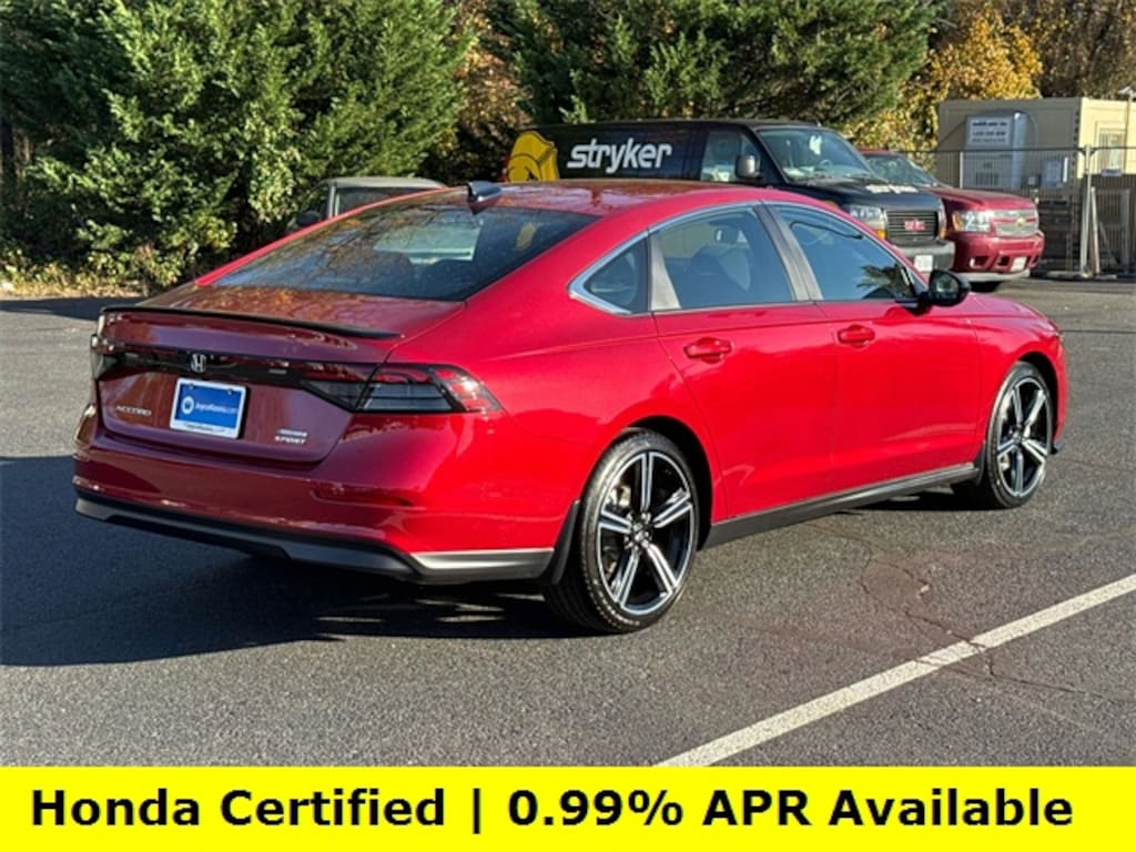 CARFAX One-Owner. Clean CARFAX. Certified. Radiant Red Metallic 2025 Honda Accord Hybrid Sport ***ONE OWNER***, ***LOW MILES***, ***DEALER MAINTAINED***, ***EXCELLENT CONDITION***, ***HONDA CERTIFIED***, ***ADAPTIVE CRUISE CONTROL***, ***ALLOY WHEELS***, ***BACK UP CAMERA***, ***BLIND SIDE MONITORING***, ***FORWARD COLLISION ALERT***, ***LANE DEPARTURE WARNING***, ***POWER MOONROOF***, ***POWER SEAT***, ***REMOTE START***, HondaTrue Certified Certified, 2.0L I4 DOHC 16V, 4-Wheel Disc Brakes, 8 Speakers, ABS brakes, Adaptive Cruise Control: Adaptive Cruise Control (ACC) with Low-Speed Follow, Air Conditioning, Alloy wheels, AM/FM radio, Apple CarPlay/Android Auto, Auto High-beam Headlights, Automatic temperature control, Blind Spot Information (BSI) System warning, Brake assist, Bumpers: body-color, Compass, Delay-off headlights, Driver door bin, Driver vanity mirror, Dual front impact airbags, Dual front side impact airbags, Electronic Stability Control, Emergency communication system: HondaLink, Exterior Parking Camera Rear, Fabric Seat Trim, Four wheel independent suspension, Front anti-roll bar, Front Bucket Seats, Front Center Armrest, Front dual zone A/C, Front reading lights, Fully automatic headlights, Heated Front Bucket Seats, Heated front seats, Illuminated entry, Knee airbag, Lane departure: Lane Keeping Assist System (LKAS) active, Leather Shift Knob, Leather steering wheel, Low tire pressure warning, Occupant sensing airbag, Outside temperature display, Overhead airbag, Overhead console, Panic alarm, Passenger door bin, Passenger vanity mirror, Power door mirrors, Power driver seat, Power moonroof, Power steering, Power windows, Radio data system, Radio: 180-Watt Audio System, Rear anti-roll bar, Rear reading lights, Rear seat center armrest, Rear side impact airbag, Rear window defroster, Remote keyless entry, Security system, Speed control, Speed-sensing steering, Speed-Sensitive Wipers, Split folding rear seat, Spoiler, Steering wheel mounted audio controls, Telescoping steering wheel, Tilt steering wheel, Traction control, Trip computer, Variably intermittent wipers, Wheels: 19" x 8.5J Berlina Black, 2.0L I4 DOHC 16V.