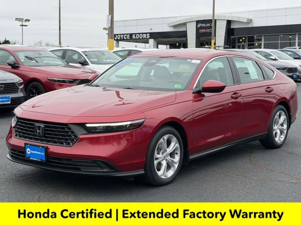 CARFAX One-Owner. Clean CARFAX. Certified. Radiant Red Metallic 2025 Honda Accord LX ***ONE OWNER***, ***LOW MILES***, ***DEALER MAINTAINED***, ***EXCELLENT CONDITION***, ***HONDA CERTIFIED***, ***ADAPTIVE CRUISE CONTROL***, ***ALLOY WHEELS***, ***BACK UP CAMERA***, ***FORWARD COLLISION ALERT***, ***LANE DEPARTURE WARNING***, HondaTrue Certified Certified, Gray Cloth, 4 Speakers, 4-Wheel Disc Brakes, ABS brakes, Adaptive Cruise Control: Adaptive Cruise Control (ACC) with Low-Speed Follow, Air Conditioning, Alloy wheels, AM/FM radio, Apple CarPlay/Android Auto, Auto High-beam Headlights, Automatic temperature control, Brake assist, Bumpers: body-color, Compass, Delay-off headlights, Driver door bin, Driver vanity mirror, Dual front impact airbags, Dual front side impact airbags, Electronic Stability Control, Emergency communication system: HondaLink Assist, Exterior Parking Camera Rear, Fabric Seat Trim, Four wheel independent suspension, Front anti-roll bar, Front Bucket Seats, Front Center Armrest, Front reading lights, Fully automatic headlights, Illuminated entry, Knee airbag, Lane departure: Lane Keeping Assist System (LKAS) active, Low tire pressure warning, Occupant sensing airbag, Outside temperature display, Overhead airbag, Overhead console, Panic alarm, Passenger door bin, Passenger vanity mirror, Power door mirrors, Power steering, Power windows, Radio data system, Radio: 160-Watt Audio System, Rear anti-roll bar, Rear reading lights, Rear seat center armrest, Rear side impact airbag, Rear window defroster, Remote keyless entry, Security system, Speed control, Speed-sensing steering, Speed-Sensitive Wipers, Steering wheel mounted audio controls, Tachometer, Telescoping steering wheel, Tilt steering wheel, Traction control, Trip computer, Variably intermittent wipers, Wheels: 17" x 7.5J Blade Silver, Gray Cloth.