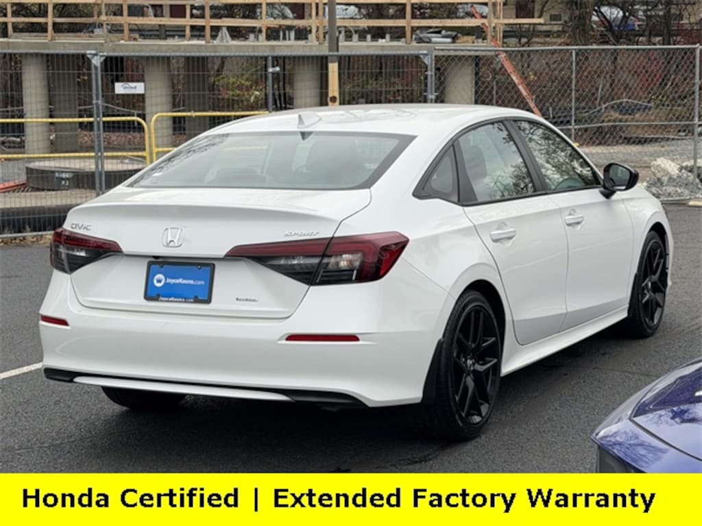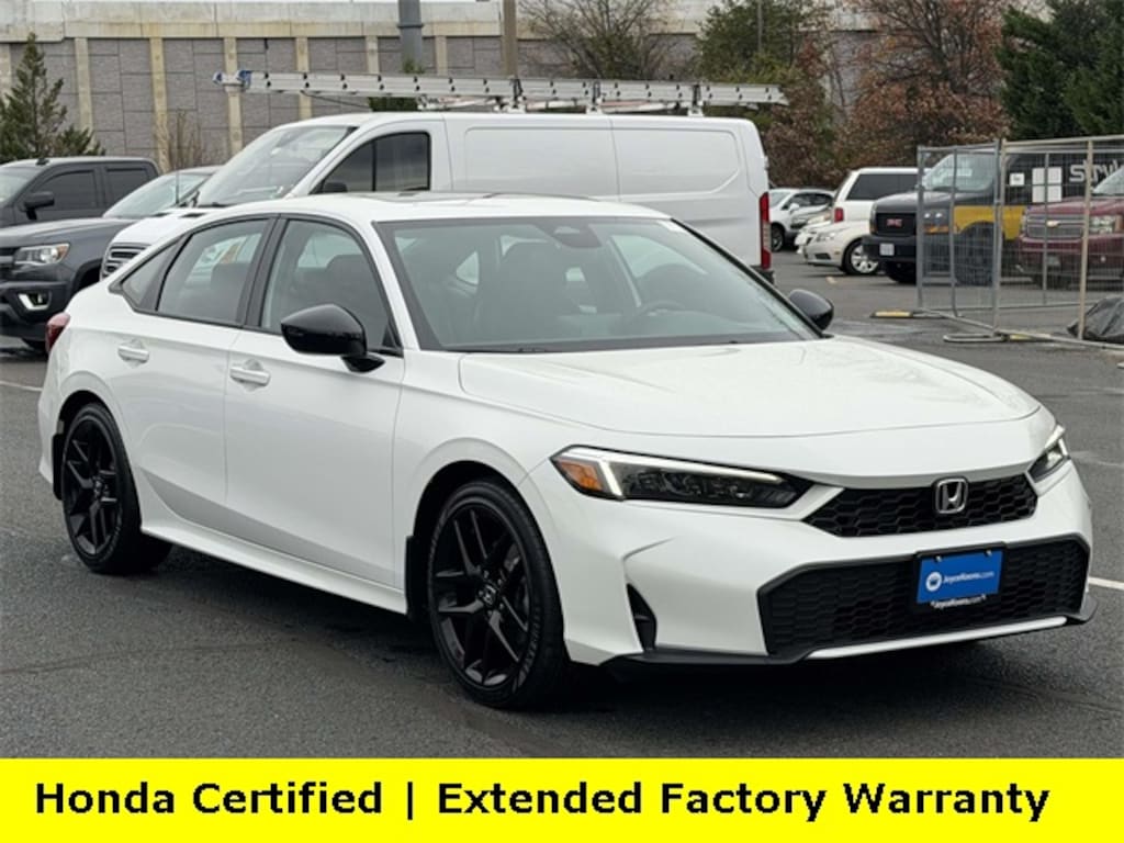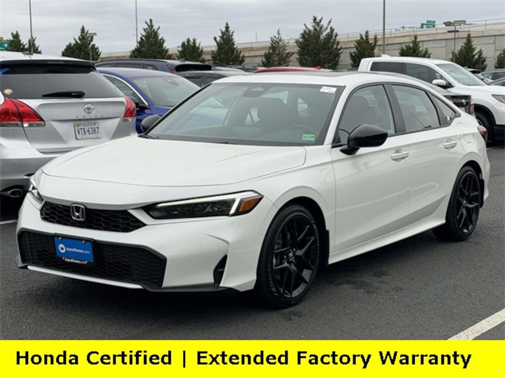 CARFAX One-Owner. Clean CARFAX. Certified. Platinum White Pearl 2025 Honda Civic Hybrid Sport ***ONE OWNER***, ***LOW MILES***, ***DEALER MAINTAINED***, ***EXCELLENT CONDITION***, ***HONDA CERTIFIED***, ***ADAPTIVE CRUISE CONTROL***, ***ALLOY WHEELS***, ***BACK UP CAMERA***, ***BLIND SIDE MONITORING***, ***FORWARD COLLISION ALERT***, ***LANE DEPARTURE WARNING***, ***HEATED SEATS***, ***POWER MOONROOF***, ***REMOTE START***, HondaTrue Certified Certified, 2.0L 16V DOHC, 4-Wheel Disc Brakes, 8 Speakers, ABS brakes, Adaptive Cruise Control: Adaptive Cruise Control (ACC) with Low-Speed Follow, Air Conditioning, Alloy wheels, AM/FM radio, Apple CarPlay/Android Auto, Auto High-beam Headlights, Automatic temperature control, Blind Spot Information (BSI) System warning, Brake assist, Bumpers: body-color, Cloth/Leatherette Seat Trim, Delay-off headlights, Driver door bin, Driver vanity mirror, Dual front impact airbags, Dual front side impact airbags, Electronic Stability Control, Emergency communication system: HondaLink, Exterior Parking Camera Rear, Four wheel independent suspension, Front anti-roll bar, Front Bucket Seats, Front Center Armrest, Front dual zone A/C, Front reading lights, Fully automatic headlights, Heated door mirrors, Heated Front Bucket Seats, Heated front seats, Illuminated entry, Knee airbag, Leather Shift Knob, Leather steering wheel, Low tire pressure warning, Occupant sensing airbag, Outside temperature display, Overhead airbag, Panic alarm, Passenger door bin, Passenger vanity mirror, Power door mirrors, Power moonroof, Power steering, Power windows, Radio data system, Radio: 180-Watt Audio System, Rear anti-roll bar, Rear seat center armrest, Rear side impact airbag, Rear window defroster, Remote keyless entry, Security system, Speed control, Speed-sensing steering, Split folding rear seat, Steering wheel mounted audio controls, Tachometer, Telescoping steering wheel, Tilt steering wheel, Traction control, Trip computer, Variably intermittent wipers, Wheels: 18" Gloss Black Alloy, 2.0L 16V DOHC.