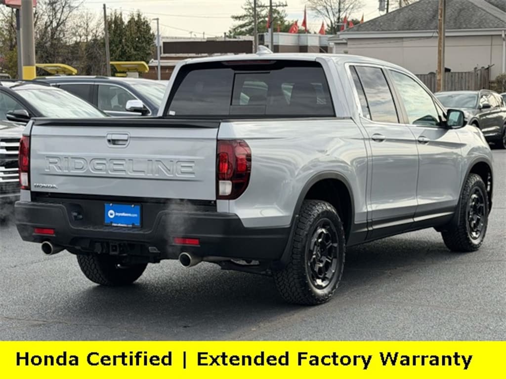 CARFAX One-Owner. Clean CARFAX. Certified. Solar Silver Metallic 2025 Honda Ridgeline RTL ***ONE OWNER***, ***LOW MILES***, ***DEALER MAINTAINED***, ***EXCELLENT CONDITION***, ***HONDA CERTIFIED***, ***ALL WHEEL DRIVE***, ***ADAPTIVE CRUISE CONTROL***, ***ALLOY WHEELS***, ***BACK UP CAMERA***, ***BED LINER***, ***BLIND SIDE MONITORING***, ***FORWARD COLLISION ALERT***, ***LANE DEPARTURE WARNING***, ***HEATED SEATS***, ***LEATHER***, ***SIRIUS XM RADIO***, ***POWER MOONROOF***, ***POWER SEATS***, ***REMOTE START***, HondaTrue Certified Certified, Black Leather, Fender Flares (PPO), Front Grille (PPO), HPD Package, HPD+ Package, 4-Wheel Disc Brakes, 4.33 Axle Ratio, 7 Speakers, ABS brakes, Air Conditioning, Alloy wheels, AM/FM radio: SiriusXM, Auto-dimming Rear-View mirror, Automatic temperature control, Blind Spot Information (BSI) System warning, Bluetooth® Hands-Free Link, Brake assist, Bumpers: body-color, Compass, Delay-off headlights, Driver door bin, Driver vanity mirror, Driver's Seat Mounted Armrest, Dual front impact airbags, Dual front side impact airbags, Electronic Stability Control, Emergency communication system: HondaLink Assist, Exterior Parking Camera Rear, Four wheel independent suspension, Front anti-roll bar, Front Bucket Seats, Front dual zone A/C, Front fog lights, Front reading lights, Fully automatic headlights, Garage door transmitter: HomeLink, Heated door mirrors, Heated Front Bucket Seats, Heated front seats, Illuminated entry, Leather Seat Trim, Leather steering wheel, Low tire pressure warning, Memory seat, Occupant sensing airbag, Outside temperature display, Overhead airbag, Overhead console, Panic alarm, Passenger door bin, Passenger seat mounted armrest, Passenger vanity mirror, Power door mirrors, Power driver seat, Power moonroof, Power passenger seat, Power steering, Power windows, Radio data system, Radio: 215-Watt Audio System w/7 Speakers, Rear air conditioning, Rear anti-roll bar, Rear reading lights, Rear seat center armrest, Rear step bumper, Rear window defroster, Remote keyless entry, Security system, SiriusXM, Speed control, Speed-sensing steering, Split folding rear seat, Steering wheel mounted audio controls, Tachometer, Telescoping steering wheel, Tilt steering wheel, Traction control, Trip computer, Turn signal indicator mirrors, Variably intermittent wipers, Wheels: 18" HPD Black Alloy, Black Leather, Fender Flares (PPO), Front Grille (PPO), HPD Package, HPD+ Package.