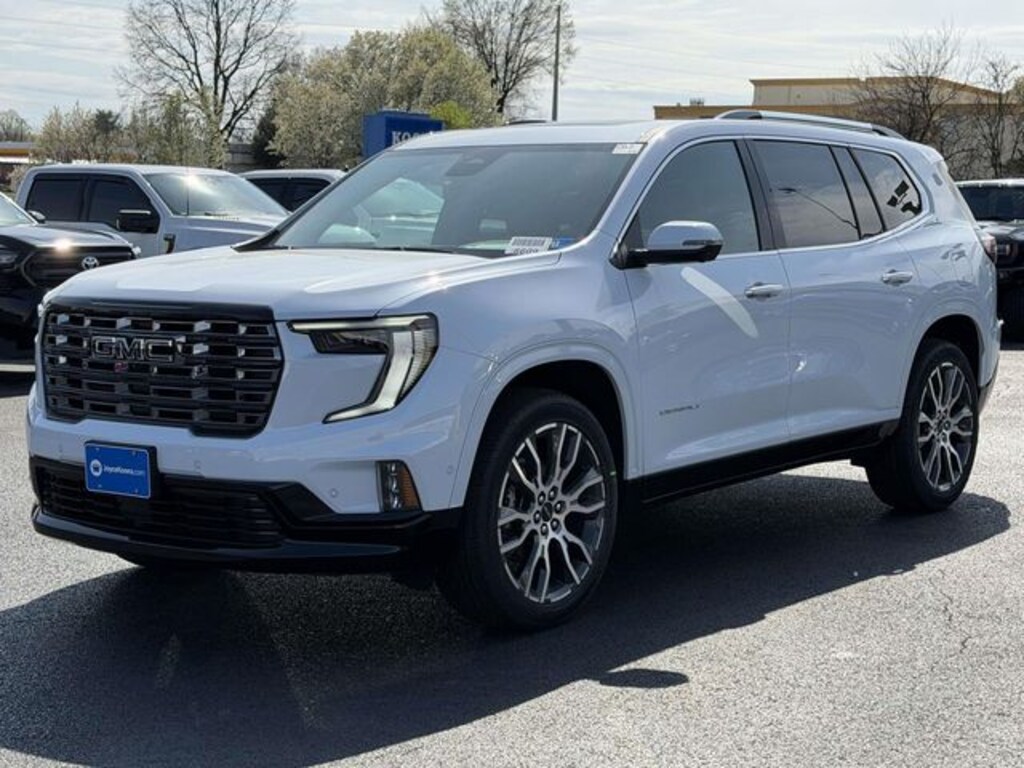 Glacier White Tricoat 2026 GMC Acadia Denali Ultimate AWD 8-Speed Automatic 2.5L DOHC AWD, Woodland Mahogany Leather.
