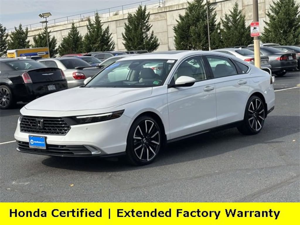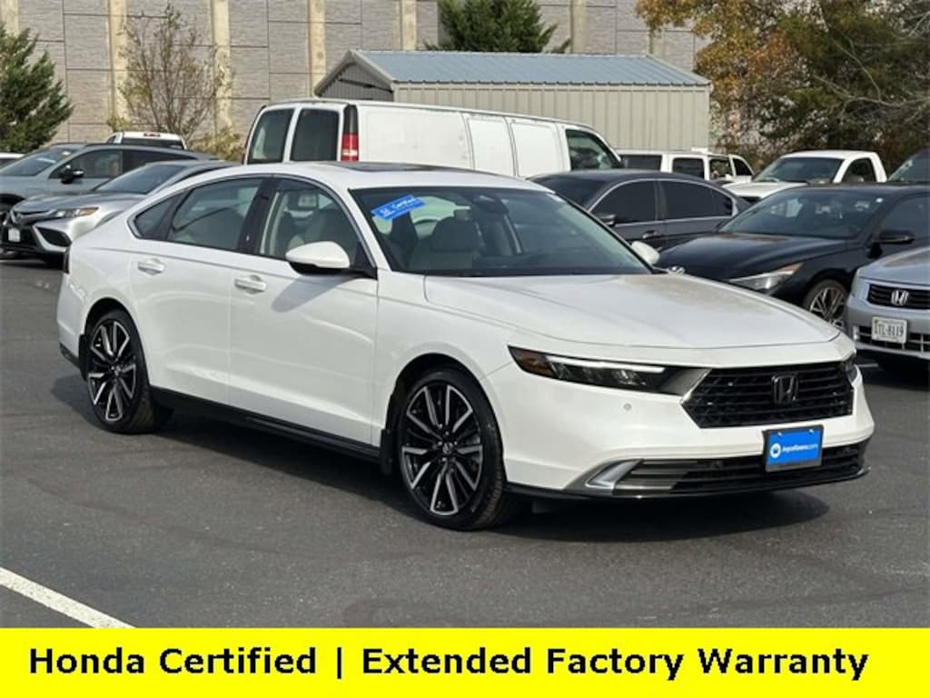 CARFAX One-Owner. Clean CARFAX. Certified. Platinum White Pearl 2025 Honda Accord Hybrid Touring ***ONE OWNER***, ***LOW MILES***, ***DEALER MAINTAINED***, ***EXCELLENT CONDITION***, ***LOADED***, ***HONDA CERTIFIED***, ***ADAPTIVE CRUISE CONTROL***, ***ALLOY WHEELS***, ***BACK UP CAMERA***, ***HEADS UP DISPLAY***, ***COOLED SEATS***, ***BLIND SIDE MONITORING***, ***FORWARD COLLISION ALERT***, ***LANE DEPARTURE WARNING***, ***HEATED SEATS***, ***HEATED STEERING WHEEL***, ***LEATHER***, ***BOSE SOUND***, ***POWER MOONROOF***, ***POWER SEATS***, ***REMOTE START***, HondaTrue Certified Certified, 2.0L I4 DOHC 16V, 12 Speakers, 4-Wheel Disc Brakes, ABS brakes, Adaptive Cruise Control: Adaptive Cruise Control (ACC) with Low-Speed Follow, Air Conditioning, Alloy wheels, AM/FM radio, Apple CarPlay/Android Auto, Auto High-beam Headlights, Auto-dimming Rear-View mirror, Automatic temperature control, Blind Spot Information (BSI) System warning, Bose Premium Sound System, Brake assist, Bumpers: body-color, Compass, Delay-off headlights, Driver door bin, Driver vanity mirror, Dual front impact airbags, Dual front side impact airbags, Electronic Stability Control, Emergency communication system: HondaLink, Exterior Parking Camera Rear, Four wheel independent suspension, Front anti-roll bar, Front Bucket Seats, Front Center Armrest, Front dual zone A/C, Front reading lights, Fully automatic headlights, Heads-Up Display, Heated & Ventilated Front Bucket Seats, Heated door mirrors, Heated front seats, Heated rear seats, Heated steering wheel, Illuminated entry, Knee airbag, Lane departure: Lane Keeping Assist System (LKAS) active, Leather Shift Knob, Leather steering wheel, Leather-Trimmed Seat Trim, Low tire pressure warning, Memory seat, Navigation System, Occupant sensing airbag, Outside temperature display, Overhead airbag, Overhead console, Panic alarm, Passenger door bin, Passenger vanity mirror, Power door mirrors, Power driver seat, Power moonroof, Power passenger seat, Power steering, Power windows, Radio data system, Rain sensing wipers, Rear anti-roll bar, Rear reading lights, Rear seat center armrest, Rear side impact airbag, Rear window defroster, Remote keyless entry, Security system, Speed control, Speed-sensing steering, Speed-Sensitive Wipers, Split folding rear seat, Steering wheel mounted audio controls, Telescoping steering wheel, Tilt steering wheel, Traction control, Trip computer, Turn signal indicator mirrors, Variably intermittent wipers, Ventilated front seats, Wheels: 19 x 8.5J Berlina Black, 2.0L I4 DOHC 16V.