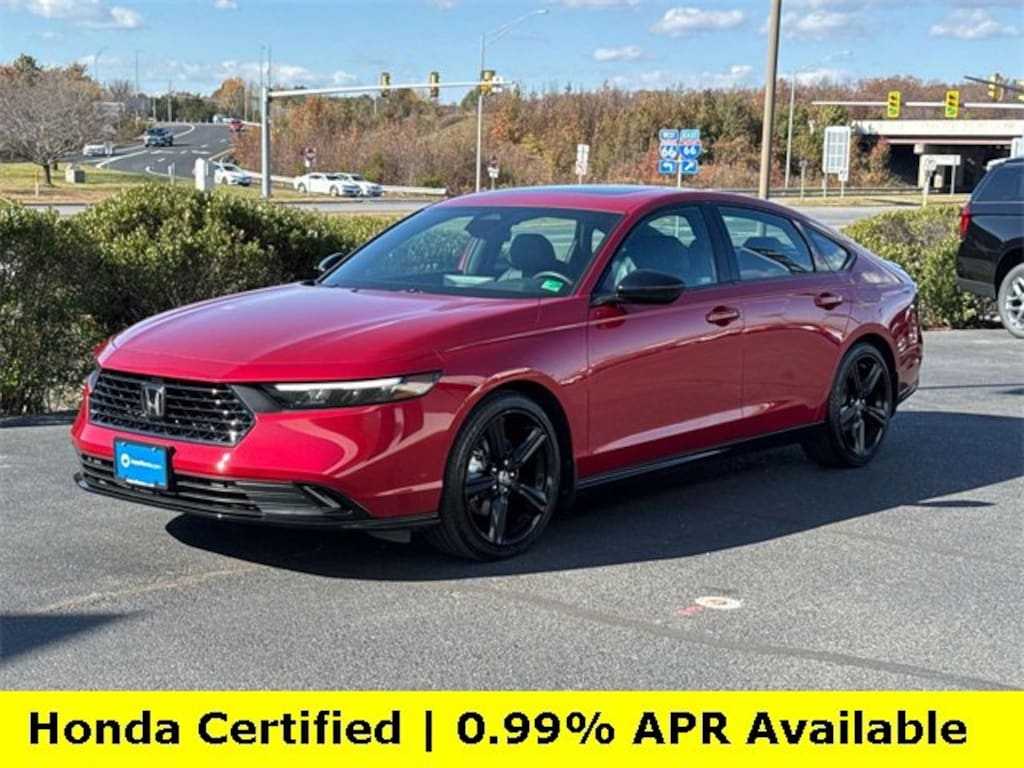 CARFAX One-Owner. Clean CARFAX. Certified. Radiant Red Metallic 2025 Honda Accord Hybrid Sport-L ***ONE OWNER***, ***LOW MILES***, ***DEALER MAINTAINED***, ***EXCELLENT CONDITION***, ***HONDA CERTIFIED***, ***ADAPTIVE CRUISE CONTROL***, ***ALLOY WHEELS***, ***BACK UP CAMERA***, ***BLIND SIDE MONITORING***, ***FORWARD COLLISION ALERT***, ***LANE DEPARTURE WARNING***, ***HEATED SEATS***, ***LEATHER***, ***POWER MOONROOF***, ***POWER SEATS***, ***REMOTE START***, HondaTrue Certified Certified, 2.0L I4 DOHC 16V, 4-Wheel Disc Brakes, 8 Speakers, ABS brakes, Adaptive Cruise Control: Adaptive Cruise Control (ACC) with Low-Speed Follow, Air Conditioning, Alloy wheels, AM/FM radio, Apple CarPlay/Android Auto, Auto High-beam Headlights, Automatic temperature control, Blind Spot Information (BSI) System warning, Brake assist, Bumpers: body-color, Compass, Delay-off headlights, Driver door bin, Driver vanity mirror, Dual front impact airbags, Dual front side impact airbags, Electronic Stability Control, Emergency communication system: HondaLink, Exterior Parking Camera Rear, Four wheel independent suspension, Front anti-roll bar, Front Bucket Seats, Front Center Armrest, Front dual zone A/C, Front reading lights, Fully automatic headlights, Heated Front Bucket Seats, Heated front seats, Illuminated entry, Knee airbag, Lane departure: Lane Keeping Assist System (LKAS) active, Leather Shift Knob, Leather steering wheel, Leather-Trimmed Seat Trim, Low tire pressure warning, Memory seat, Occupant sensing airbag, Outside temperature display, Overhead airbag, Overhead console, Panic alarm, Passenger door bin, Passenger vanity mirror, Power door mirrors, Power driver seat, Power moonroof, Power passenger seat, Power steering, Power windows, Radio data system, Radio: 180-Watt Audio System, Rear anti-roll bar, Rear reading lights, Rear seat center armrest, Rear side impact airbag, Rear window defroster, Remote keyless entry, Security system, Speed control, Speed-sensing steering, Speed-Sensitive Wipers, Split folding rear seat, Spoiler, Steering wheel mounted audio controls, Telescoping steering wheel, Tilt steering wheel, Traction control, Trip computer, Variably intermittent wipers, Wheels: 19 x 8.5J Matte Berlina Black, 2.0L I4 DOHC 16V.Here is another hand selected pre owned vehicle from Joyce Koons Honda Buick GMC. Odometer is 4702 miles below market average! 46/41 City/Highway MPGHondaTrue Certified Details:* Vehicle History* Warranty Deductible: $0* Limited Warranty: 24 Month/100,000 Mile (whichever comes first) after new car warranty expires or from certified purchase date* Transferable Warranty* Roadside Assistance* 182 Point Inspection* Powertrain Limited Warranty: 84 Month/100,000 Mile (whichever comes first) from original in-service date* Vehicles purchased within New Vehicle Limited Warranty period: extends New Vehicle Limited Warranty to 5 years*/60,000 miles*. Honda Care Roadside Assistance for 2 year/100,000 miles (whichever occurs first). Up to two complimentary oil changes within the first year of ownership. SiriusXM 90-Day Trial.