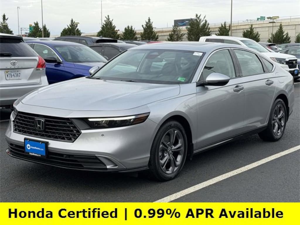 CARFAX One-Owner. Clean CARFAX. Certified. Solar Silver Metallic 2025 Honda Accord Hybrid EX-L ***ONE OWNER***, ***LOW MILES***, ***DEALER MAINTAINED***, ***EXCELLENT CONDITION***, ***HONDA CERTIFIED***, ***ADAPTIVE CRUISE CONTROL***, ***ALLOY WHEELS***, ***BACK UP CAMERA***, ***BLIND SIDE MONITORING***, ***FORWARD COLLISION ALERT***, ***LANE DEPARTURE WARNING***, ***HEATED SEATS***, ***LEATHER***, ***POWER MOONROOF***, ***POWER SEATS***, ***REMOTE START***, HondaTrue Certified Certified, 2.0L I4 DOHC 16V, 4-Wheel Disc Brakes, 8 Speakers, ABS brakes, Adaptive Cruise Control: Adaptive Cruise Control (ACC) with Low-Speed Follow, Air Conditioning, Alloy wheels, AM/FM radio, Apple CarPlay/Android Auto, Auto High-beam Headlights, Auto-dimming Rear-View mirror, Automatic temperature control, Blind Spot Information (BSI) System warning, Brake assist, Bumpers: body-color, Compass, Delay-off headlights, Driver door bin, Driver vanity mirror, Dual front impact airbags, Dual front side impact airbags, Electronic Stability Control, Emergency communication system: HondaLink, Exterior Parking Camera Rear, Four wheel independent suspension, Front anti-roll bar, Front Bucket Seats, Front Center Armrest, Front dual zone A/C, Front reading lights, Fully automatic headlights, Heated door mirrors, Heated Front Bucket Seats, Heated front seats, Illuminated entry, Knee airbag, Lane departure: Lane Keeping Assist System (LKAS) active, Leather Shift Knob, Leather steering wheel, Leather-Trimmed Seat Trim, Low tire pressure warning, Memory seat, Occupant sensing airbag, Outside temperature display, Overhead airbag, Overhead console, Panic alarm, Passenger door bin, Passenger vanity mirror, Power door mirrors, Power driver seat, Power moonroof, Power passenger seat, Power steering, Power windows, Radio data system, Radio: 180-Watt Audio System, Rear anti-roll bar, Rear reading lights, Rear seat center armrest, Rear side impact airbag, Rear window defroster, Remote keyless entry, Security system, Speed control, Speed-sensing steering, Speed-Sensitive Wipers, Split folding rear seat, Steering wheel mounted audio controls, Telescoping steering wheel, Tilt steering wheel, Traction control, Trip computer, Turn signal indicator mirrors, Variably intermittent wipers, Wheels: 17 x 7.5J Pewter Gray, 2.0L I4 DOHC 16V.Here is another hand selected pre owned vehicle from Joyce Koons Honda Buick GMC. Odometer is 913 miles below market average! 51/44 City/Highway MPGHondaTrue Certified Details:* Vehicle History* Vehicles purchased within New Vehicle Limited Warranty period: extends New Vehicle Limited Warranty to 5 years*/60,000 miles*. Honda Care Roadside Assistance for 2 year/100,000 miles (whichever occurs first). Up to two complimentary oil changes within the first year of ownership. SiriusXM 90-Day Trial.* Transferable Warranty* Powertrain Limited Warranty: 84 Month/100,000 Mile (whichever comes first) from original in-service date* Limited Warranty: 24 Month/100,000 Mile (whichever comes first) after new car warranty expires or from certified purchase date* 182 Point Inspection* Warranty Deductible: $0* Roadside Assistance