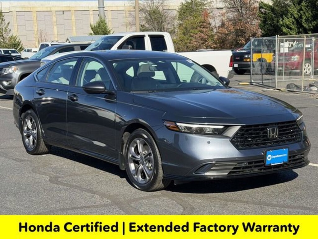 CARFAX One-Owner. Clean CARFAX. Certified. Meteorite Gray Metallic 2025 Honda Accord Hybrid EX-L ***ONE OWNER***, ***LOW MILES***, ***DEALER MAINTAINED***, ***EXCELLENT CONDITION***, ***HONDA CERTIFIED***, ***ADAPTIVE CRUISE CONTROL***, ***ALLOY WHEELS***, ***BACK UP CAMERA***, ***BLIND SIDE MONITORING***, ***FORWARD COLLISION ALERT***, ***LANE DEPARTURE WARNING***, ***HEATED SEATS***, ***LEATHER***, ***POWER MOONROOF***, ***POWER SEATS***, ***REMOTE START***, HondaTrue Certified Certified, 2.0L I4 DOHC 16V, 4-Wheel Disc Brakes, 8 Speakers, ABS brakes, Adaptive Cruise Control: Adaptive Cruise Control (ACC) with Low-Speed Follow, Air Conditioning, Alloy wheels, AM/FM radio, Apple CarPlay/Android Auto, Auto High-beam Headlights, Auto-dimming Rear-View mirror, Automatic temperature control, Blind Spot Information (BSI) System warning, Brake assist, Bumpers: body-color, Compass, Delay-off headlights, Driver door bin, Driver vanity mirror, Dual front impact airbags, Dual front side impact airbags, Electronic Stability Control, Emergency communication system: HondaLink, Exterior Parking Camera Rear, Four wheel independent suspension, Front anti-roll bar, Front Bucket Seats, Front Center Armrest, Front dual zone A/C, Front reading lights, Fully automatic headlights, Heated door mirrors, Heated Front Bucket Seats, Heated front seats, Illuminated entry, Knee airbag, Lane departure: Lane Keeping Assist System (LKAS) active, Leather Shift Knob, Leather steering wheel, Leather-Trimmed Seat Trim, Low tire pressure warning, Memory seat, Occupant sensing airbag, Outside temperature display, Overhead airbag, Overhead console, Panic alarm, Passenger door bin, Passenger vanity mirror, Power door mirrors, Power driver seat, Power moonroof, Power passenger seat, Power steering, Power windows, Radio data system, Radio: 180-Watt Audio System, Rear anti-roll bar, Rear reading lights, Rear seat center armrest, Rear side impact airbag, Rear window defroster, Remote keyless entry, Security system, Speed control, Speed-sensing steering, Speed-Sensitive Wipers, Split folding rear seat, Steering wheel mounted audio controls, Telescoping steering wheel, Tilt steering wheel, Traction control, Trip computer, Turn signal indicator mirrors, Variably intermittent wipers, Wheels: 17 x 7.5J Pewter Gray, 2.0L I4 DOHC 16V.