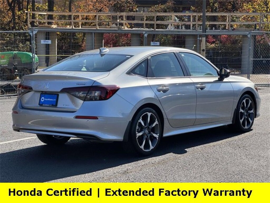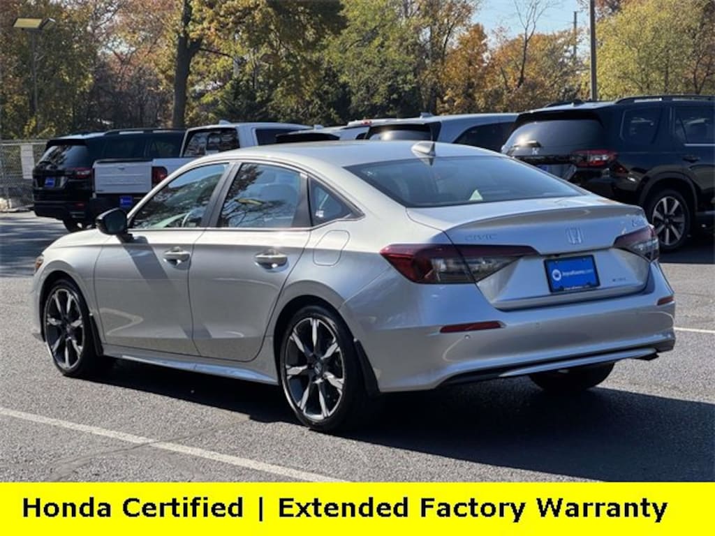 Clean CARFAX. Certified. Solar Silver Metallic 2025 Honda Civic Hybrid Sport Touring ***ONE OWNER***, ***LOW MILES***, ***DEALER MAINTAINED***, ***EXCELLENT CONDITION***, ***LOADED***, ***HONDA CERTIFIED***, ***ADAPTIVE CRUISE CONTROL***, ***ALLOY WHEELS***, ***BACK UP CAMERA***, ***BLIND SIDE MONITORING***, ***FORWARD COLLISION ALERT***, ***LANE DEPARTURE WARNING***, ***HEATED SEATS***, ***LEATHER***, ***POWER MOONROOF***, HondaTrue Certified Certified, 2.0L 16V DOHC, 12 Speakers, 4-Wheel Disc Brakes, ABS brakes, Adaptive Cruise Control: Adaptive Cruise Control (ACC) with Low-Speed Follow, Air Conditioning, Alloy wheels, AM/FM radio, Apple CarPlay/Android Auto, Auto High-beam Headlights, Auto-dimming Rear-View mirror, Automatic temperature control, Blind Spot Information (BSI) System warning, Bose Premium Sound System, Brake assist, Bumpers: body-color, Compass, Delay-off headlights, Driver door bin, Driver vanity mirror, Dual front impact airbags, Dual front side impact airbags, Electronic Stability Control, Emergency communication system: HondaLink, Exterior Parking Camera Rear, Four wheel independent suspension, Front anti-roll bar, Front Bucket Seats, Front Center Armrest, Front dual zone A/C, Front reading lights, Fully automatic headlights, Heated door mirrors, Heated Front Bucket Seats, Heated front seats, Illuminated entry, Knee airbag, Leather Shift Knob, Leather steering wheel, Leather-Trimmed Seat Trim, Low tire pressure warning, Navigation system: Google Maps, Occupant sensing airbag, Outside temperature display, Overhead airbag, Overhead console, Panic alarm, Passenger door bin, Passenger vanity mirror, Power door mirrors, Power driver seat, Power moonroof, Power passenger seat, Power steering, Power windows, Radio data system, Rain sensing wipers, Rear anti-roll bar, Rear seat center armrest, Rear side impact airbag, Rear window defroster, Remote keyless entry, Security system, Speed control, Speed-sensing steering, Split folding rear seat, Steering wheel mounted audio controls, Tachometer, Telescoping steering wheel, Tilt steering wheel, Traction control, Trip computer, Turn signal indicator mirrors, Variably intermittent wipers, Wheels: 18 Alloy w/Matte Shark Gray Inserts, 2.0L 16V DOHC.