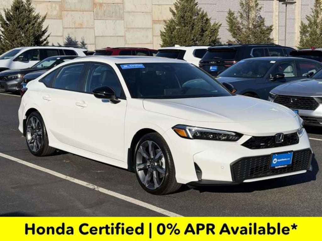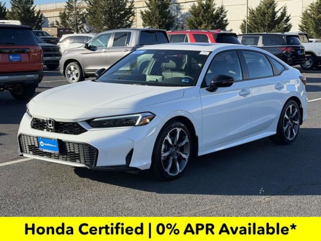 CARFAX One-Owner. Clean CARFAX. Certified. Platinum White Pearl 2026 Honda Civic Hybrid Sport Touring ***ONE OWNER***, ***LOW MILES***, ***DEALER MAINTAINED***, ***EXCELLENT CONDITION***, ***LOADED***, ***HONDA CERTIFIED***, ***ADAPTIVE CRUISE CONTROL***, ***ALLOY WHEELS***, ***BACK UP CAMERA***, ***BLIND SIDE MONITORING***, ***FORWARD COLLISION ALERT***, ***LANE DEPARTURE WARNING***, ***HEATED SEATS***, ***LEATHER***, ***BOSE SOUND***, ***NAVIGATION***, ***POWER MOONROOF***, ***POWER SEATS***, ***REMOTE START***, HondaTrue Certified Certified, 2.0L 16V DOHC, 12 Speakers, 4-Wheel Disc Brakes, ABS brakes, Adaptive Cruise Control: Adaptive Cruise Control (ACC) with Low-Speed Follow, Air Conditioning, Alloy wheels, AM/FM radio, Apple CarPlay/Android Auto, Auto High-beam Headlights, Auto-dimming Rear-View mirror, Automatic temperature control, Blind Spot Information (BSI) System warning, Bose Premium Sound System, Brake assist, Bumpers: body-color, Compass, Delay-off headlights, Driver door bin, Driver vanity mirror, Dual front impact airbags, Dual front side impact airbags, Electronic Stability Control, Emergency communication system: HondaLink, Exterior Parking Camera Rear, Four wheel independent suspension, Front anti-roll bar, Front Bucket Seats, Front Center Armrest, Front dual zone A/C, Front reading lights, Fully automatic headlights, Heated door mirrors, Heated Front Bucket Seats, Heated front seats, Illuminated entry, Knee airbag, Leather Shift Knob, Leather steering wheel, Leather-Trimmed Seat Trim, Low tire pressure warning, Navigation system: Google Maps, Occupant sensing airbag, Outside temperature display, Overhead airbag, Overhead console, Panic alarm, Passenger door bin, Passenger vanity mirror, Power door mirrors, Power driver seat, Power moonroof, Power passenger seat, Power steering, Power windows, Radio data system, Rain sensing wipers, Rear anti-roll bar, Rear seat center armrest, Rear side impact airbag, Rear window defroster, Remote keyless entry, Security system, Speed control, Speed-sensing steering, Split folding rear seat, Steering wheel mounted audio controls, Tachometer, Telescoping steering wheel, Tilt steering wheel, Traction control, Trip computer, Turn signal indicator mirrors, Variably intermittent wipers, Wheels: 18 Alloy with Matte Shark Gray Inserts, 2.0L 16V DOHC.